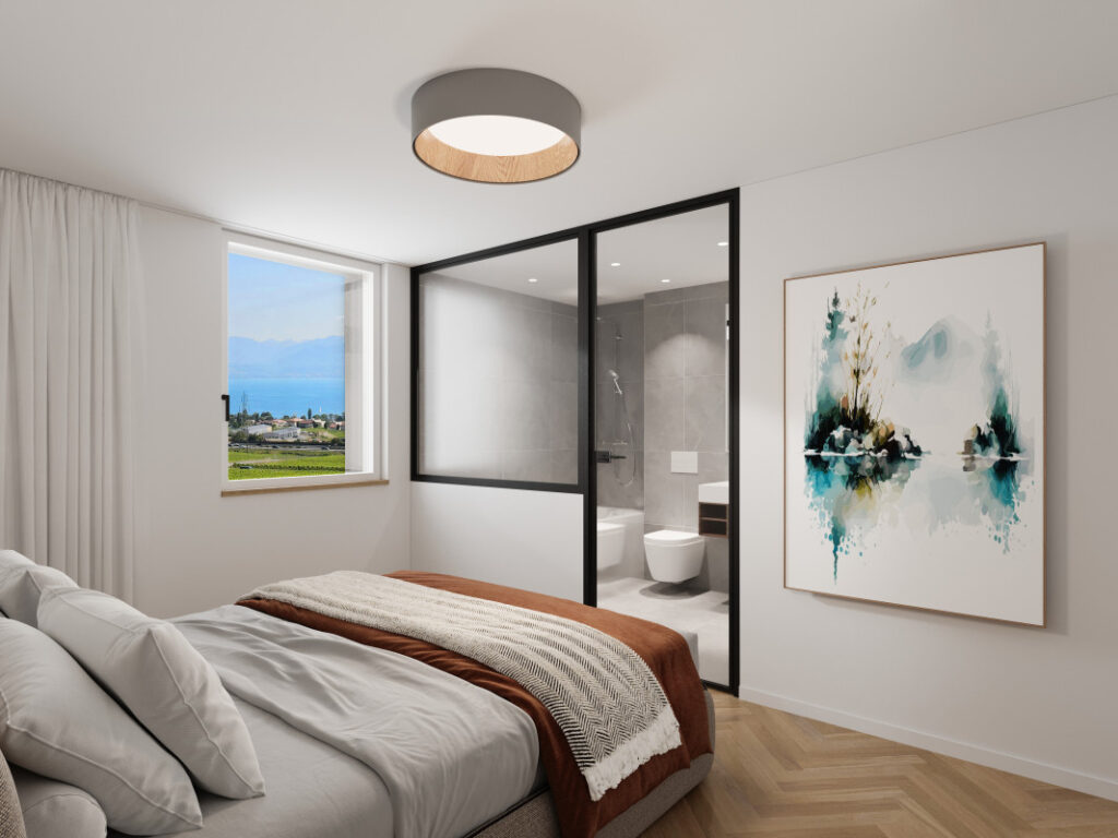Cet appartement de 4.5 pièces, situé en rez-de-chaussée, offre un cadre de vie moderne et spacieux, parfaitement adapté à une vie confortable en famille ou pour ceux qui recherchent de grands espaces. Dès l’entrée, l’espace de vie s’ouvre sur un vaste séjour lumineux, agrémenté de grandes portes-fenêtres qui donnent sur une terrasse et un magnifique jardin privatif. Ce jardin, qui s’étend sur une grande surface, offre une vue magnifique sur les vignes, le lac Léman et les montagnes, un cadre idéal pour se détendre en plein air.